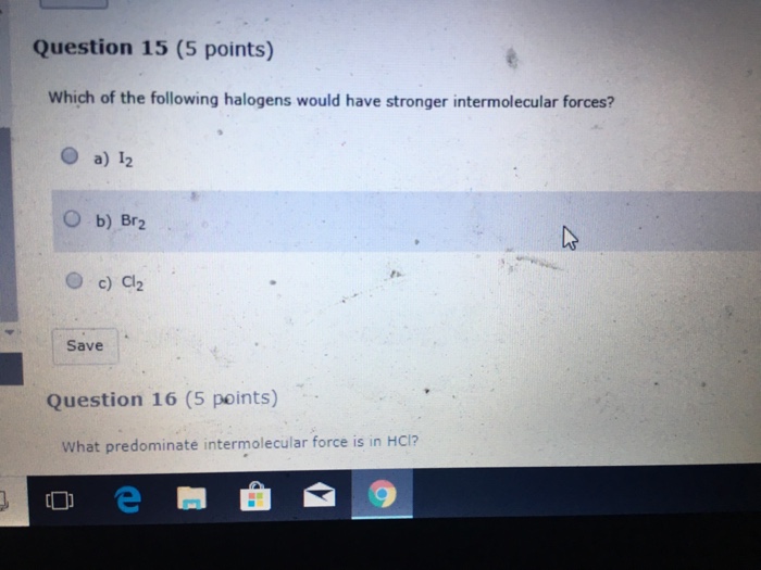 Volume close contact between atoms and molecules high density compared to gases. F 2 and Cl 2 are gases at room temperature reflecting weaker attractive forces. Question 1 0 1 pts Which of the following halogens would have stronger intermolecular forces.